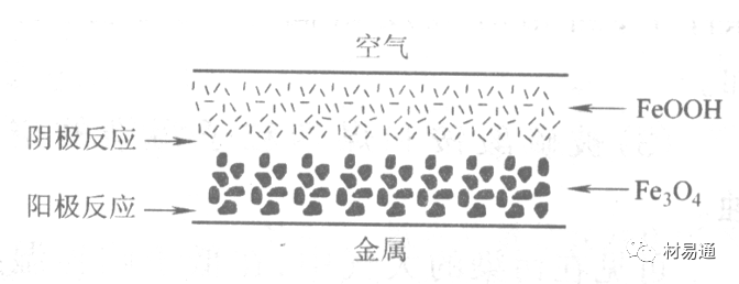 大气腐蚀条件不同,锈层成分和结构是很复杂的。Evans认为大气腐蚀的锈层处在潮湿条件下,锈层起强氧化剂作用,在锈层内阳极反应发生在金属/Fe3O4界面上: