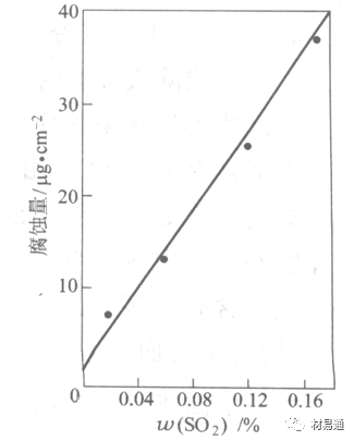 铁、锌等金属在SO2大气中生成易溶的硫酸盐化合物,它们的腐蚀速度和大气中SO2含量呈直线关系上升。