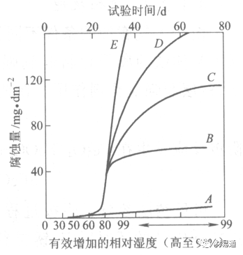 湿度是决定大气腐蚀类型和速度的一个重要因素。把大气腐蚀速度开始剧增时的大气相对湿度值称为临界湿度。对于铁、钢、铜、锌,临界湿度约在70%~80%之间。由图7可见,湿度小于临界湿度,腐蚀速度很慢,几乎不腐蚀。若把湿度降至临界湿度以下,可防止金属发生大气腐蚀。