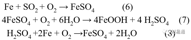 •二有一部分SO2吸附在金属表面上,与Fe作用生成易溶的硫酸亚铁,FeSO4进一步氧化并由于强烈的水解作用生成了H2SO4,H2SO4再与Fe作用,按这种循环方式加速腐蚀。