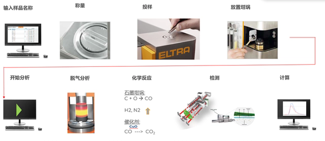 钢铁中氧氮氢元素的主流的测试方式目前还是使用惰性气体熔融法对样品进行分析。该方法的分析原理是:样品中的氧氮氢元素在惰性气体条件下,通过高温加热将氧氮氢元素释放出来。氧转化为CO和CO2混合物,催化剂将其中的 CO 氧化成CO2。通过红外检测池测出CO2 的含量从而推算出氧的含量,N和H的含量则以N2和H2的形式,通过热导检测器测出。