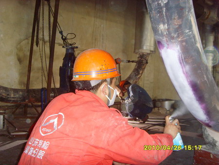放置一段时间后将表面的着色剂冲洗掉。在已经清洗干净的表面涂上显影剂,损伤部位由于着色剂渗入其中从而看得一清二楚。 主要利用毛细现象使渗透液渗入缺陷,经清洗剂清洗使表面渗透液清除,而缺陷中的渗透液残留,再利用显像剂的毛细管作用吸附出缺陷中残留的渗透液而达到检验缺陷的目的。